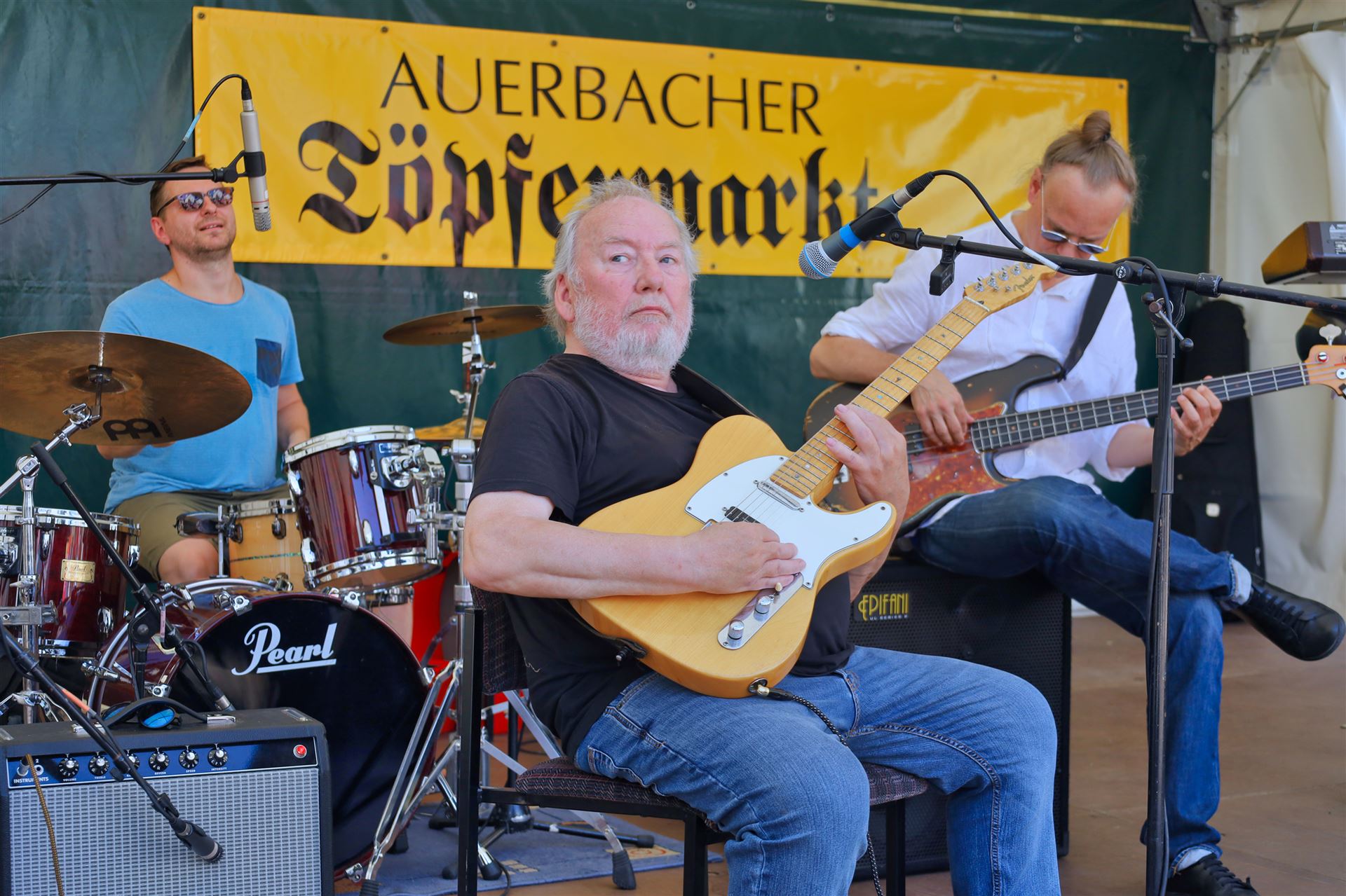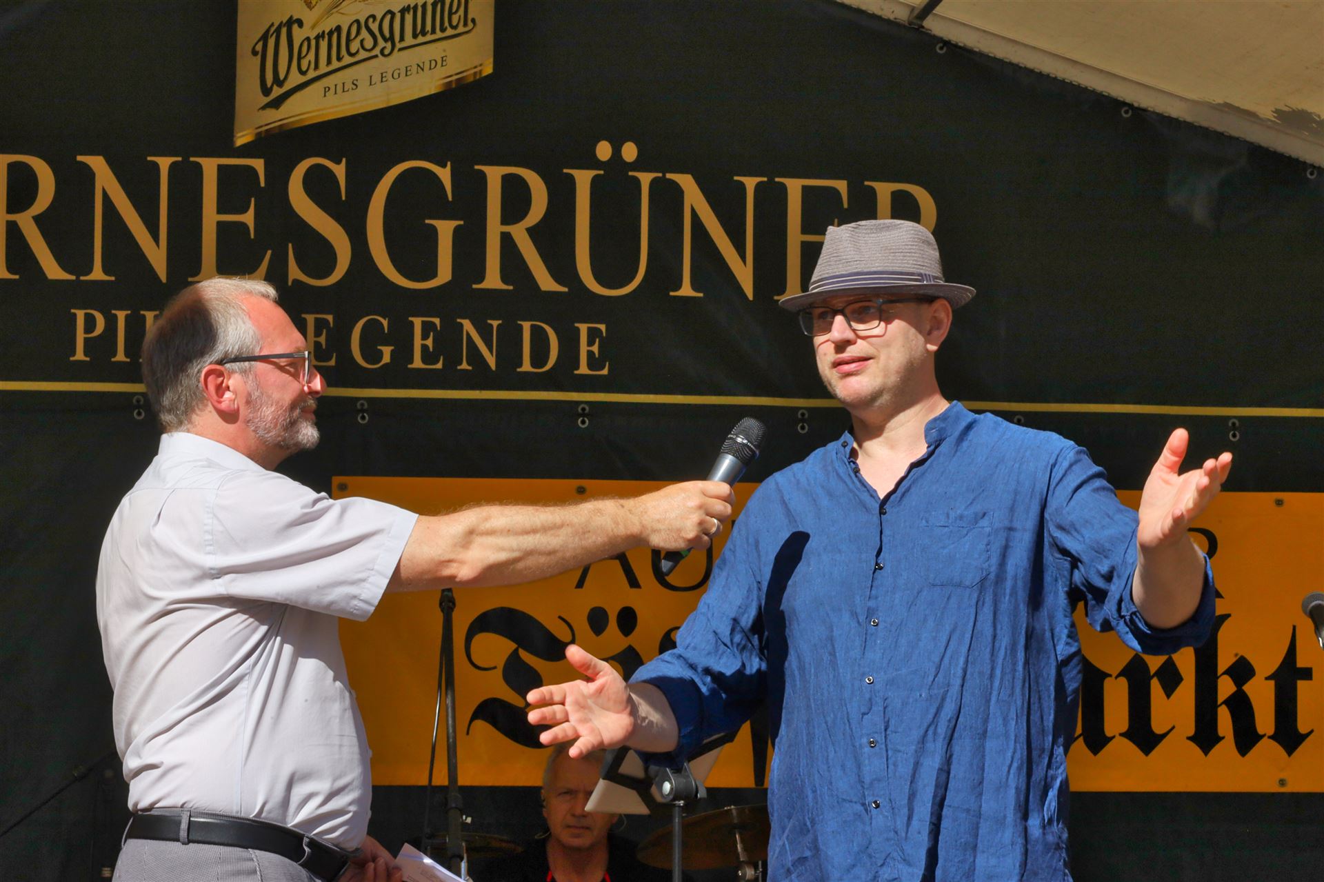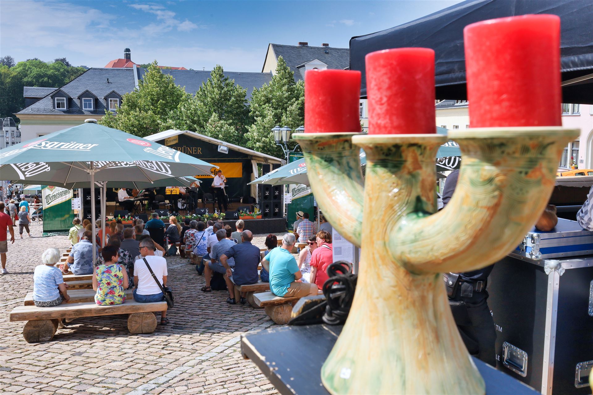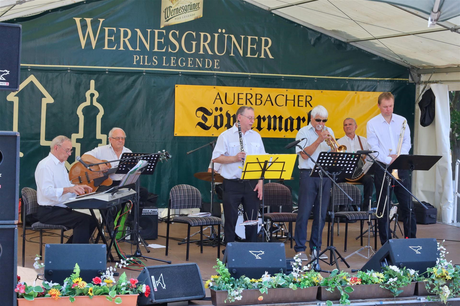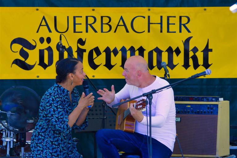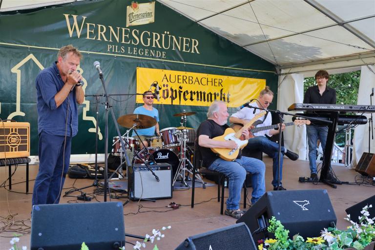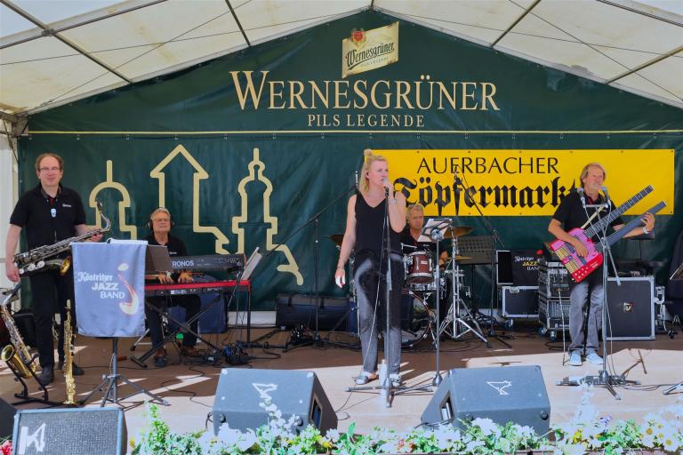 Wie immer zum Töpfermarkt auf dem Auerbacher Altmarkt wurde von den Besuchern kein Eintritt verlangt. Das verdient große Anerkennung, denn immerhin standen namhafte "Jazzer" auf der Bühne, für deren Konzerte anderswo viel Geld für Tickets zu löhnen ist.